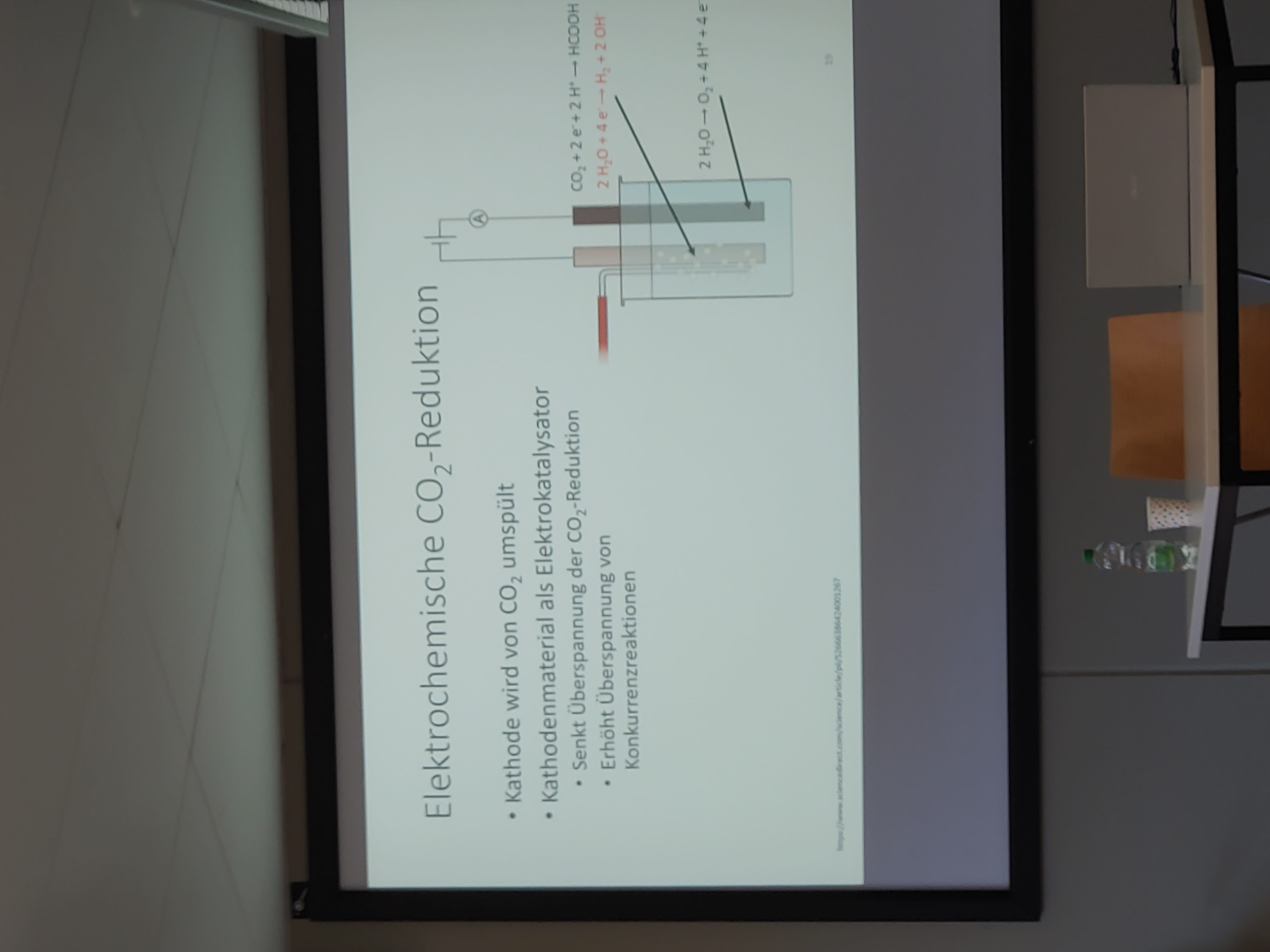 Die Reaktionsgleichung oben zeigt die Protonengekoppelte Elektronentransferreaktion, die bei der Reduktion von CO2 zur Ameisensäure auf Kathodenseite stattfindet ( Quelle: Präsentation von Vivian Keune).